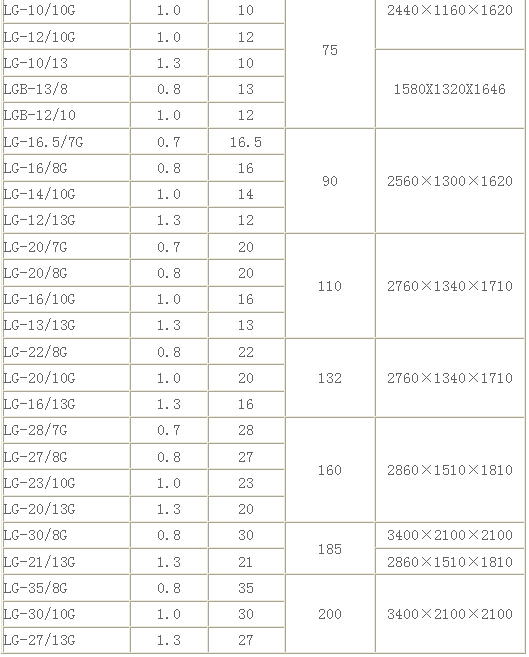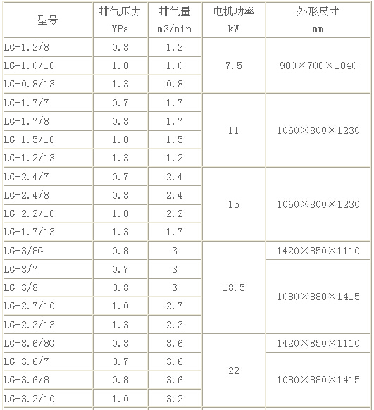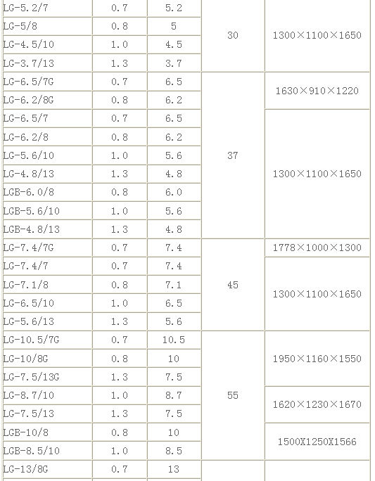 四、 全面符合甚至超越GB19153-2003《容積式空氣壓縮機(jī)能效限定值》國家標(biāo)準(zhǔn)的要求。 LG系列電動(dòng)固定螺桿式空氣壓縮機(jī)技術(shù)參數(shù) |